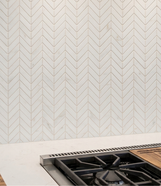 Transform your kitchen into a masterpiece with the captivating allure of Calacatta marble backsplash tiles.